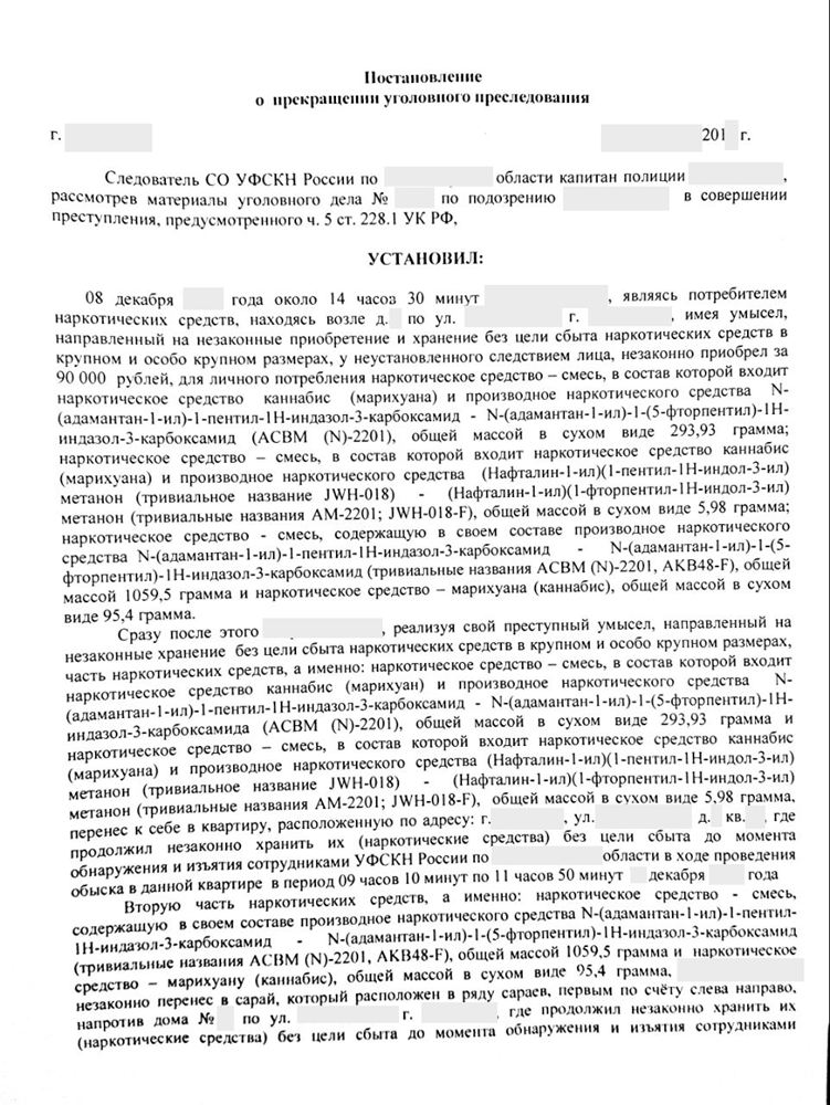 В результате эффективной работы более полугода удалось добиться приговора о прекращении уголовного дела по статье 228 ч.5 УК РФ